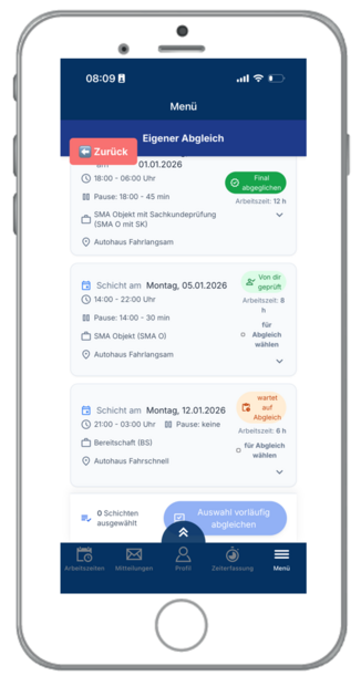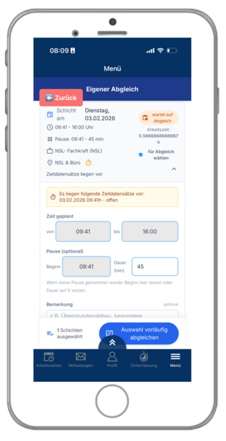 Sie haben hier die Möglichkeit Ihre Arbeitszeiten zu erfassen und vorläufig abzugleichen. Sollte Ihre Arbeitszeit von der geplanten Schicht abweichen, können Sie zusätzlich eine Bemerkung und die tatsächlichen Zeiten eintragen.